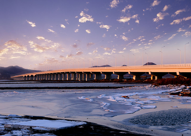 大橋工程分為主橋、預(yù)制段引橋和北側(cè)現(xiàn)澆段引橋,其中主橋長500米,主跨為120米的大跨變截面預(yù)應(yīng)力混凝土連續(xù)箱梁,是當時東北地區(qū)跨度最大的連續(xù)梁跨海橋。大橋的設(shè)計結(jié)合了使用和景觀的雙重功能,作為普灣經(jīng)濟區(qū)核心位置的地標性景觀,獨具特色的夜景設(shè)計使其成為經(jīng)濟區(qū)一道亮麗的風景線。